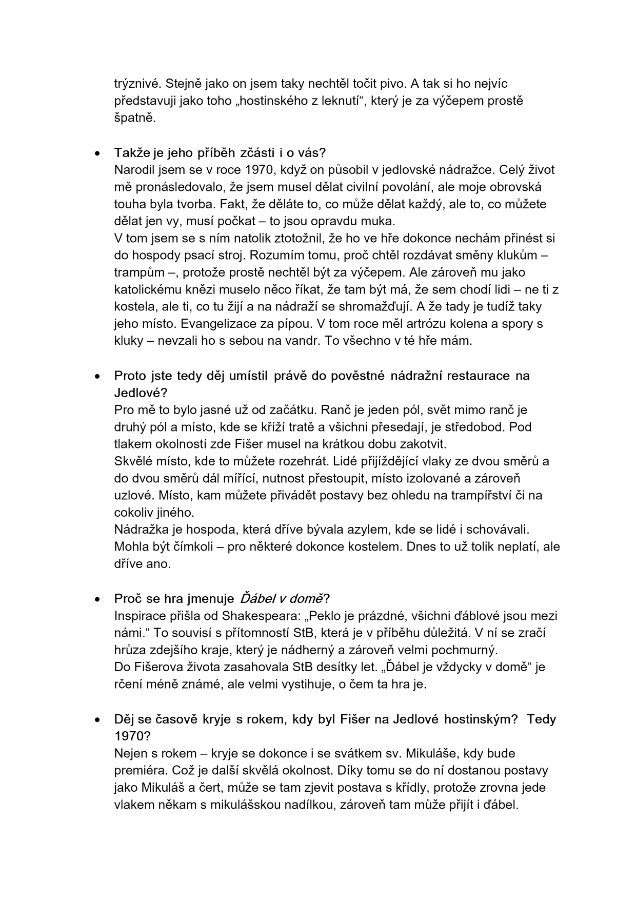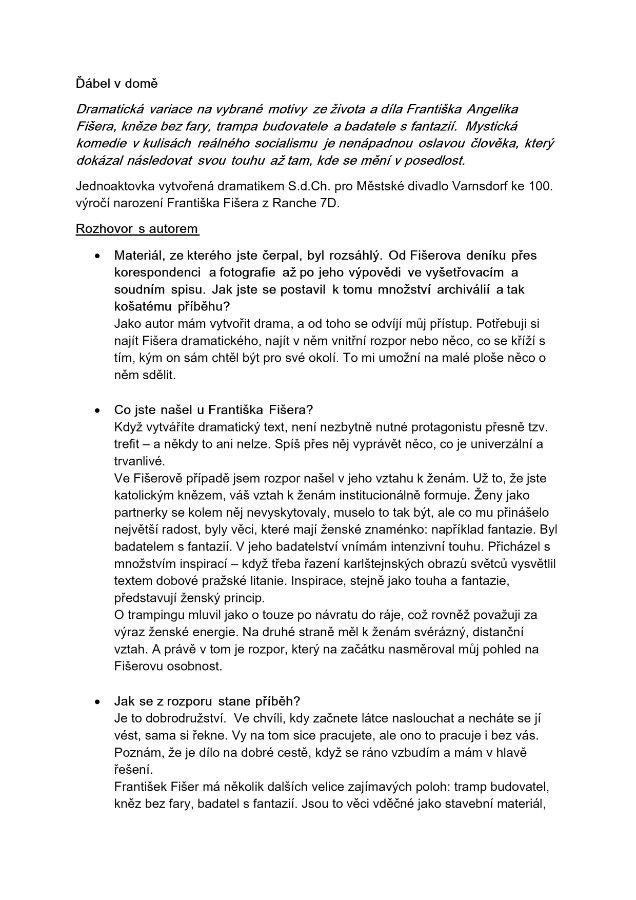 Normalizační dramatická variace na vybrané motivy ze života a díla Františka Angelika Fišera, kněze bez fary, trampa budovatele a badatele s fantazií. Píše se samotný počátek sedmdesátých let minulého století. V nádražní restauraci na zapadlém horském nádraží se chystá hostinský Andělík v pauze mezi dvěma vlaky pracovat na historické studii o výzdobě karlštejnských kaplí. Bude mít alespoň hodinu svatý klid? Je pátého prosince, a zatímco se v okolních obcích chystají Mikuláši, čerti a andělé k nadílce, za nádražím pokryl brzký soumrak velikou rudou skvrnu na bílém sněhu, jejíž původ přijíždí prošetřit dvojice esenbáků na sajdkáře. Náčelník stanice přebírá přes okénko vlaku od řádových sester objemný balík, podél lesa se vysokým sněhem brodí postava s křídly na zádech a s akordeonem přes rameno a v prázdném lokále se zapomněl host v šusťákové bundě, o němž nikdo neví. Jednoaktovka autora S.d.Ch. je mystickou komedií v kulisách reálného socialismu a nenápadnou oslavou člověka, který dokázal následoval svou touhu až tam, kde se mění v posedlost. Ďábel je, totiž, vždycky už v domě.