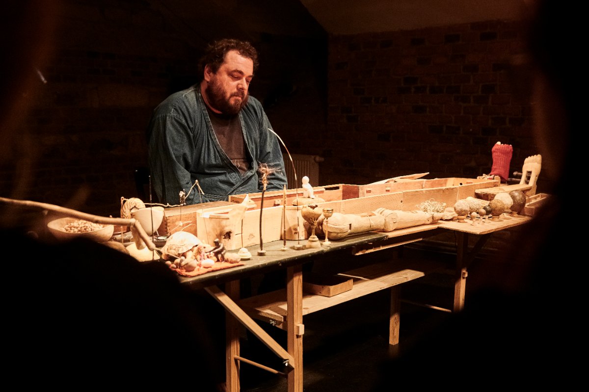 Loutkové divadlo ku chvále geniálních lékařů a ranhojičů. Kdo ze smrtelníků bude tak netečný, aby nepřistupoval k prohlídce nitra lidského těla s jakousi zvláštní touhou.Divadelní vanitas jednoho animátora a zároveň patologa, který oživuje i pitvá svět věcí a loutek, dále stůl s dřevěným korpusem jako svého druhu schránkou plnou ostatků různéhoskupenství i rodu a neustále hrající magnetofon. Vstup do těla je vždy prolomením tabu, neboť narušuje kosmickou jednotu. O makrokosmos i mikrokosmos tu jde především.Absolutní unpacking.