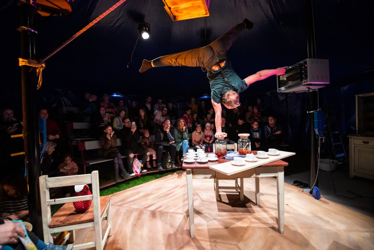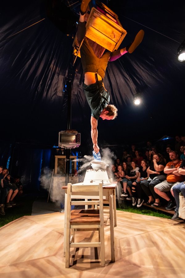 Rodinná akrobaticko-kuchařská show ve vlastním šapitó je oslavou tradičního i nového cirkusu. Teacrobat je humorné sólo v akrobatově kuchyni, kam zve na pořádnou porci zábavy a voňavý perník. Svou manéž artista vybavil kredencí, špajzkou, nechybí stůl ani židle a mezi vším se navíc udržuje v kondici! Cvičí, protahuje se, balancuje s věcmi, překonává výškové rozdíly, a to hravě a s lehkostí. Štědrý hostitel nabízí bohatou paletu cirkusového umění, jehož pochoutky servíruje formou výstupů při vykonávání každodenních činností, které zahrnují přípravu pohoštění. V představení se hlavní a jediný hrdina otáčí nejen s vařečkou a okolo čajových šálků, ale také se ukazuje jako excelentní ekvilibrista, fenomenální stojkař a roztomilý klaun. Autorský projekt Teacrobat je příběhem velkého cirkusového snu o vlastním šapitó. Michal Mudrák si nechal na míru ušít stan a nejen, že si jej umí postavit, ale celé představení si odehraje, odzvučí i odsvítí. Pak zabalí, zbourá a jede dál… V Dánsku získal cenu Den Danske Cirkuspris.