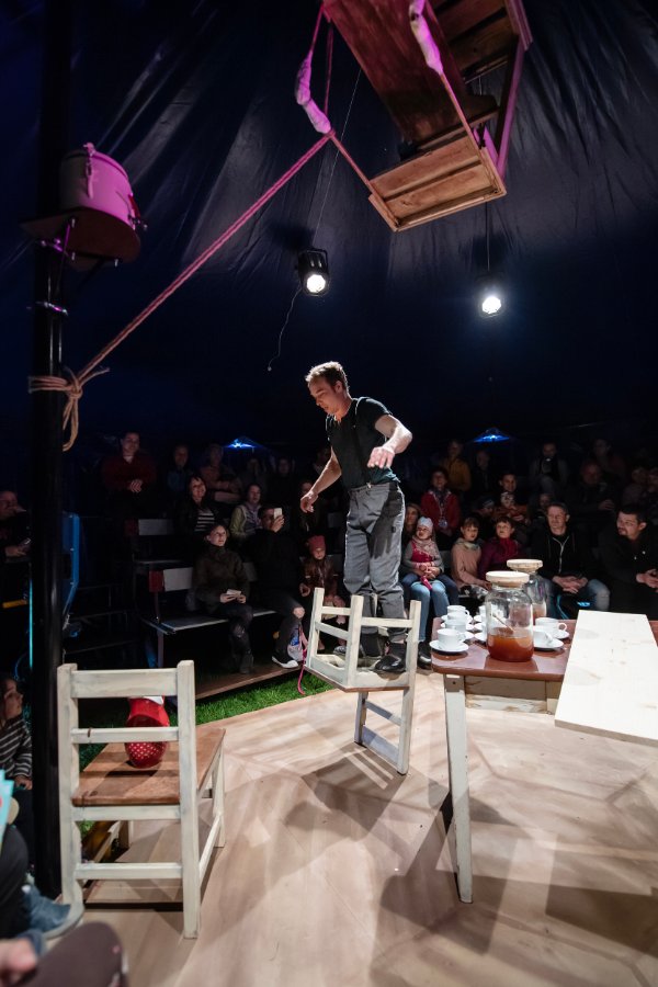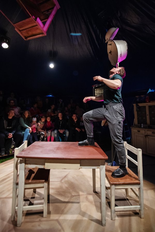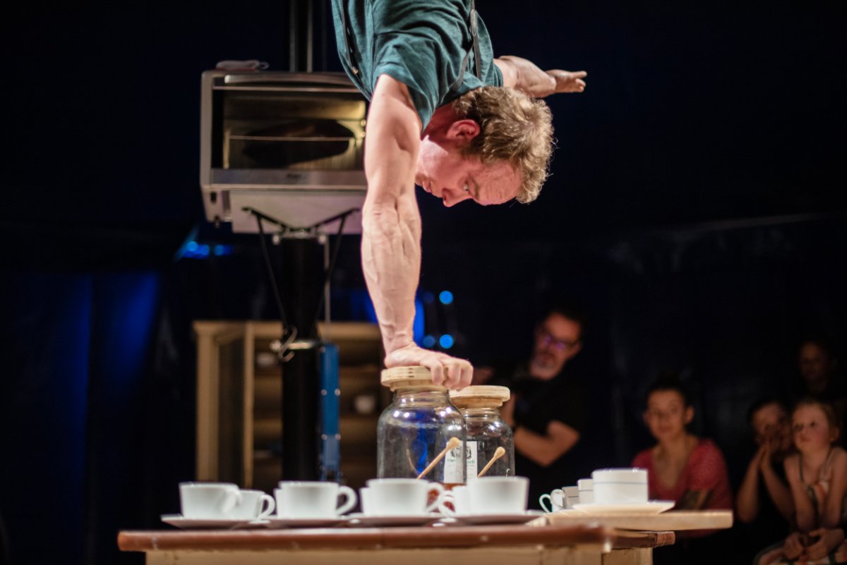 Rodinná akrobaticko-kuchařská show ve vlastním šapitó je oslavou tradičního i nového cirkusu. Teacrobat je humorné sólo v akrobatově kuchyni, kam zve na pořádnou porci zábavy a voňavý perník. Svou manéž artista vybavil kredencí, špajzkou, nechybí stůl ani židle a mezi vším se navíc udržuje v kondici! Cvičí, protahuje se, balancuje s věcmi, překonává výškové rozdíly, a to hravě a s lehkostí. Štědrý hostitel nabízí bohatou paletu cirkusového umění, jehož pochoutky servíruje formou výstupů při vykonávání každodenních činností, které zahrnují přípravu pohoštění. V představení se hlavní a jediný hrdina otáčí nejen s vařečkou a okolo čajových šálků, ale také se ukazuje jako excelentní ekvilibrista, fenomenální stojkař a roztomilý klaun. Autorský projekt Teacrobat je příběhem velkého cirkusového snu o vlastním šapitó. Michal Mudrák si nechal na míru ušít stan a nejen, že si jej umí postavit, ale celé představení si odehraje, odzvučí i odsvítí. Pak zabalí, zbourá a jede dál… V Dánsku získal cenu Den Danske Cirkuspris.